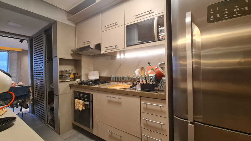 A cozinha americana se conecta de forma natural com a sala, trazendo praticidade e convivência. O espaço conta com bancada/ilha com área para banquetas, excelente para refeições rápidas e para receber amigos. Também se nota um conjunto bem resolvido de acabamentos e marcenaria, com proposta contemporânea e funcional.